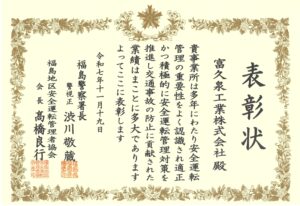 11月19日に、第53回福島市交通安全市民大会が行われ、福島警察署長・福島地区安全運転管理者協会より、優良安全運転管理事業所として表彰されました。